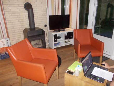 Wohnbereich mit Kamin und Hifi - Anlage.