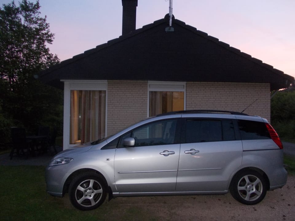 seitliche Ansicht unseres 4 Personen Bungalow. Hinten eine kleine Terrasse mit 4 Stühlen