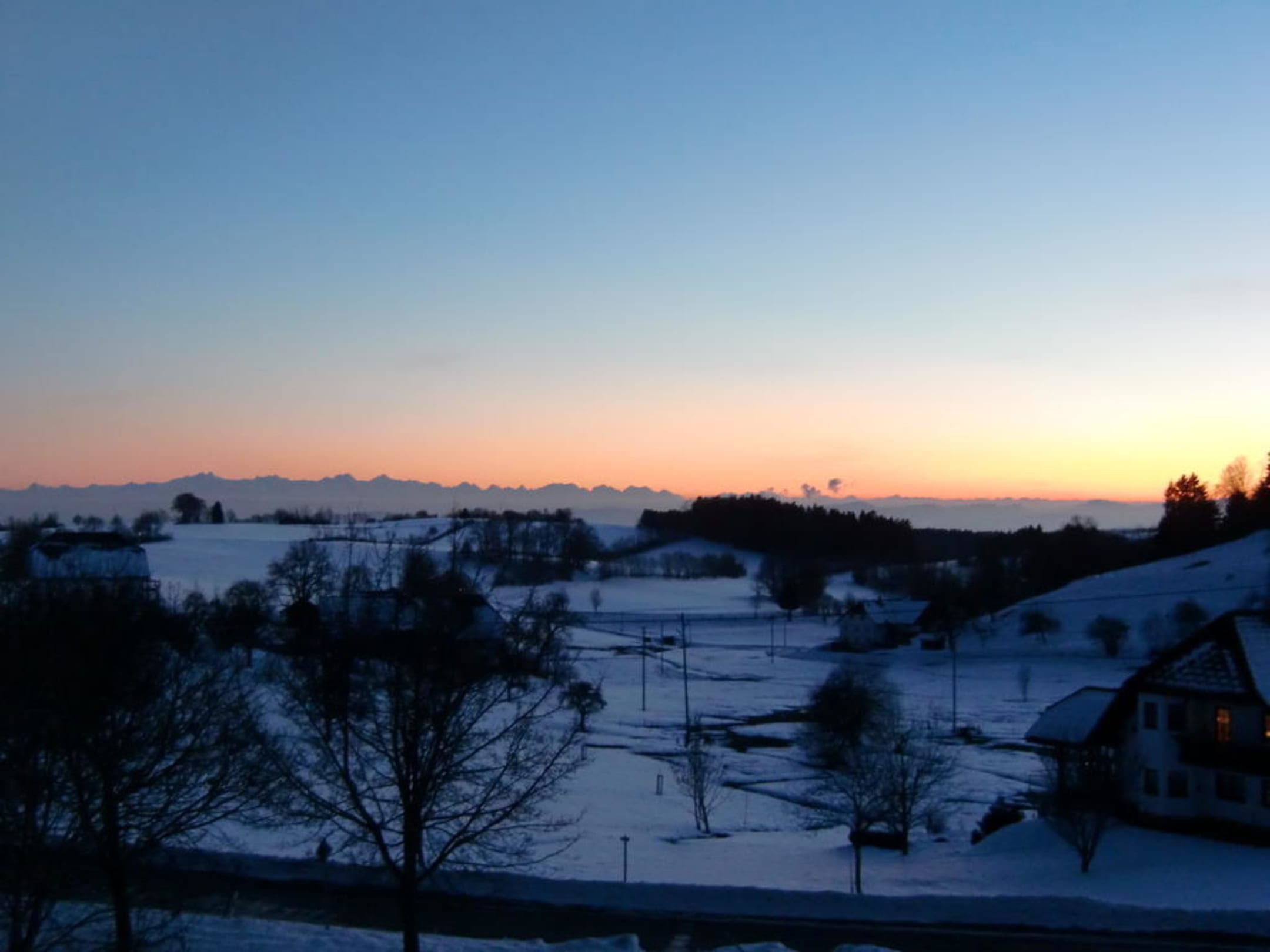 Aus dem Zimmerfenster mit Blick auf die Schweizer Alpen