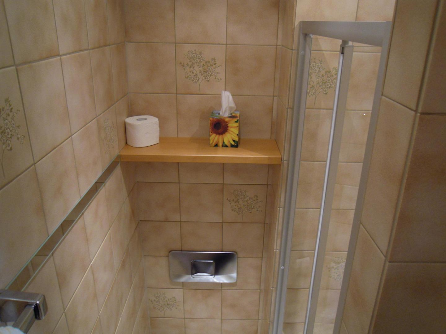 Toilette (unten) und rechts die Duschkabine