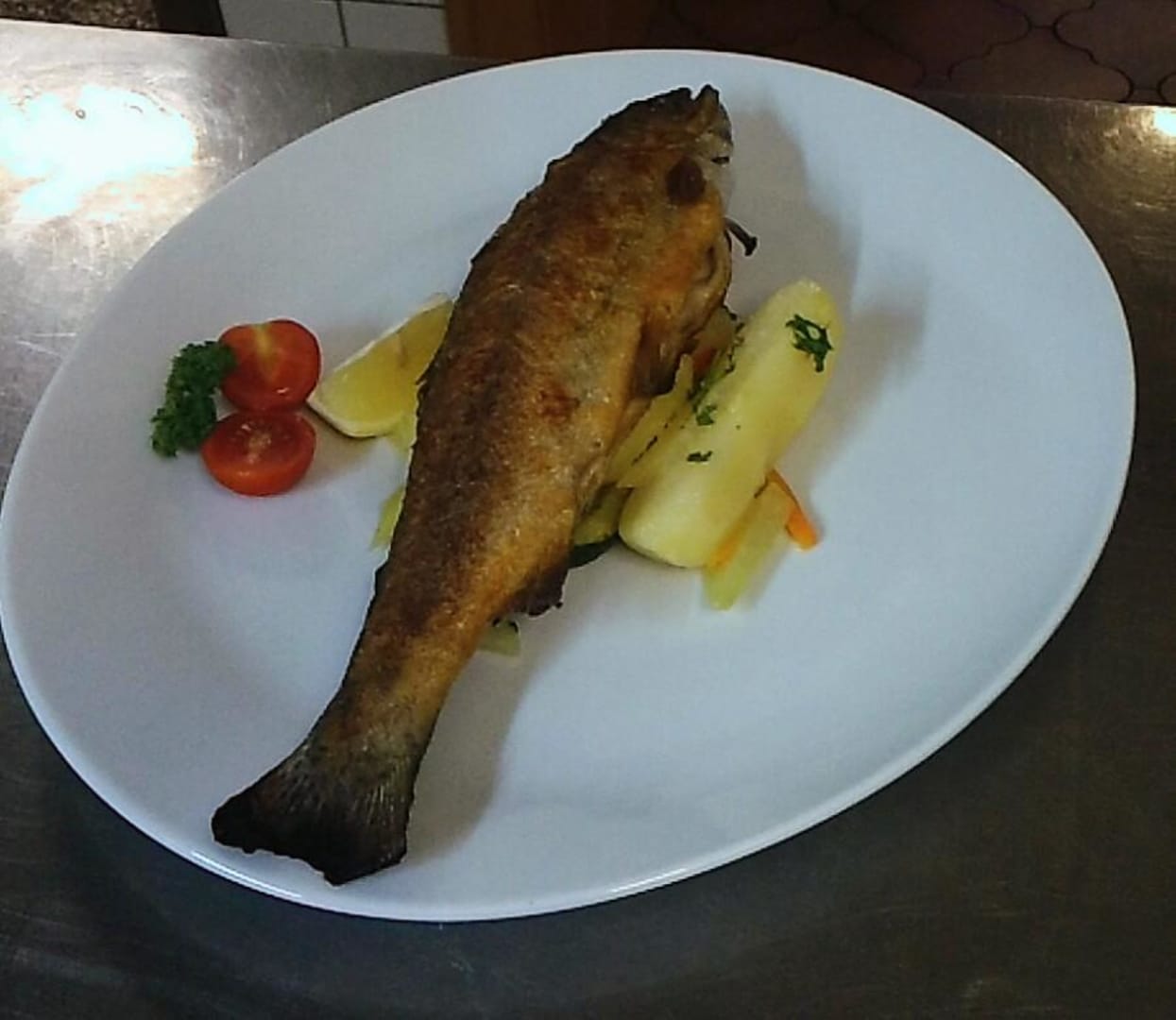 Bayerwald Forelle direkt aus dem Wasser auf dem Ti