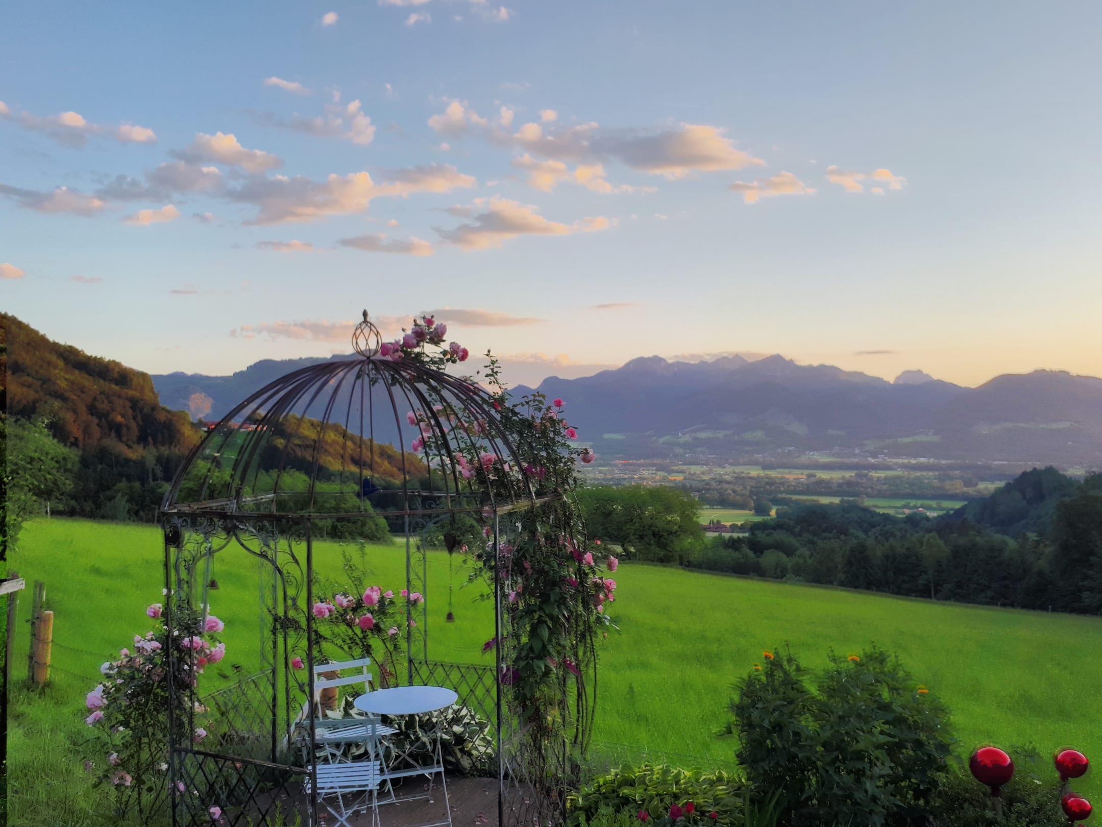 Rosenpavillon im Garten und tolle Aussicht auf die Bergen