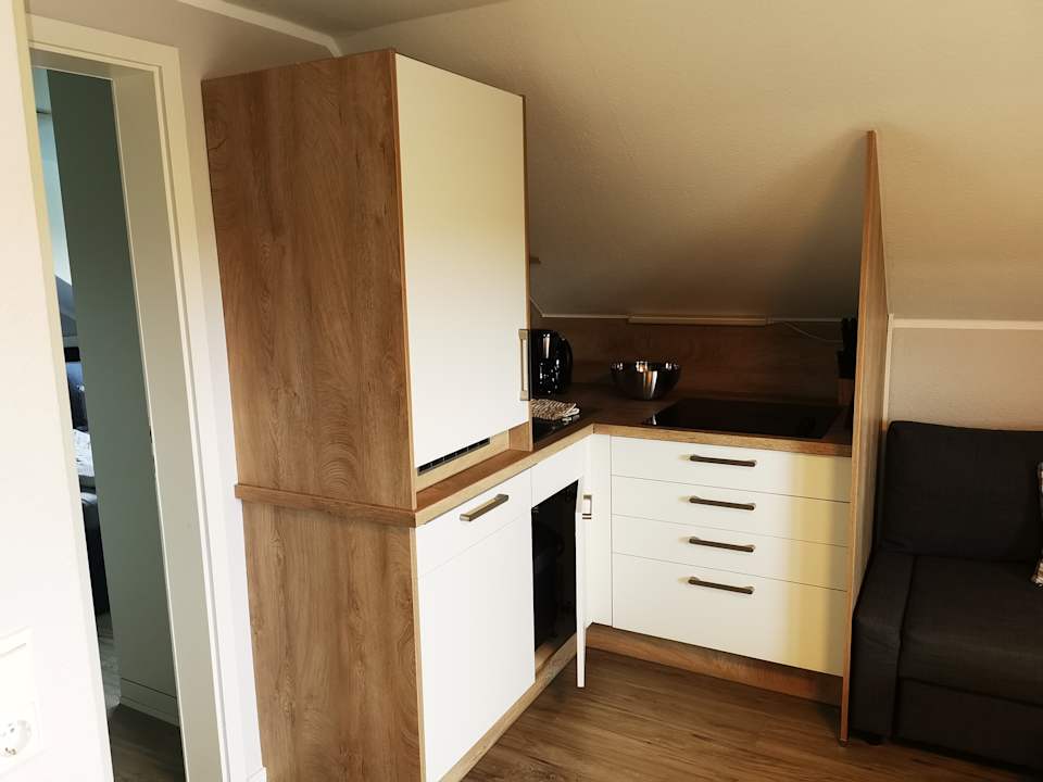 Küche Familienappartment mit Kaffeemaschine und Wasserkocher, drei Kochplatten