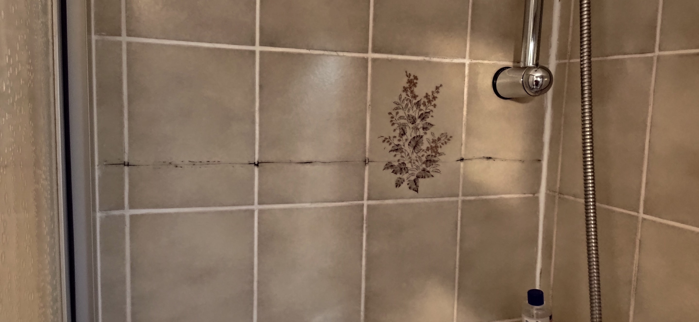 Dusche im Bad, Fliesen gerissen, Türe wacklig und somit undicht.