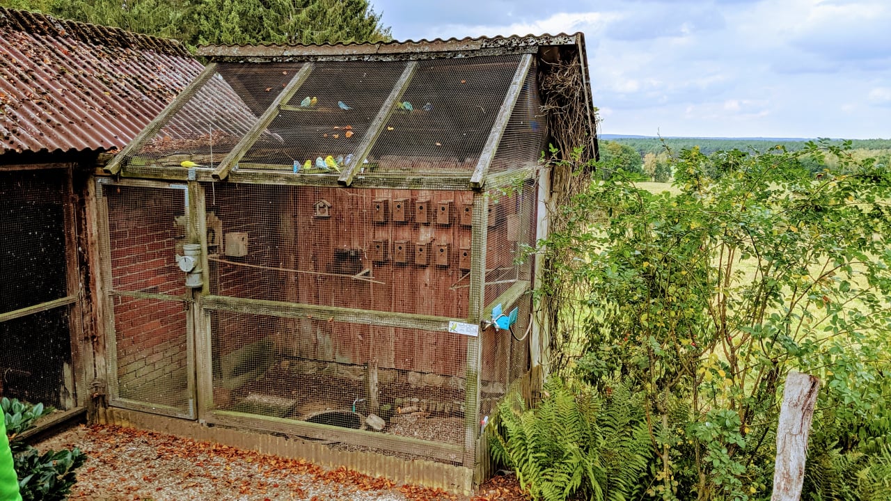 Vogelvoliere mit Wellensittichen im Garten
