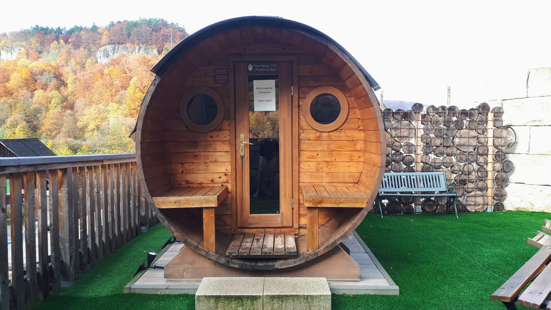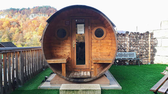 Sport & Freizeitauch von dieser Fass- Sauna hatte nan eine sagenhafte Aussicht auf die Jurafelsen und den Herbstwald...