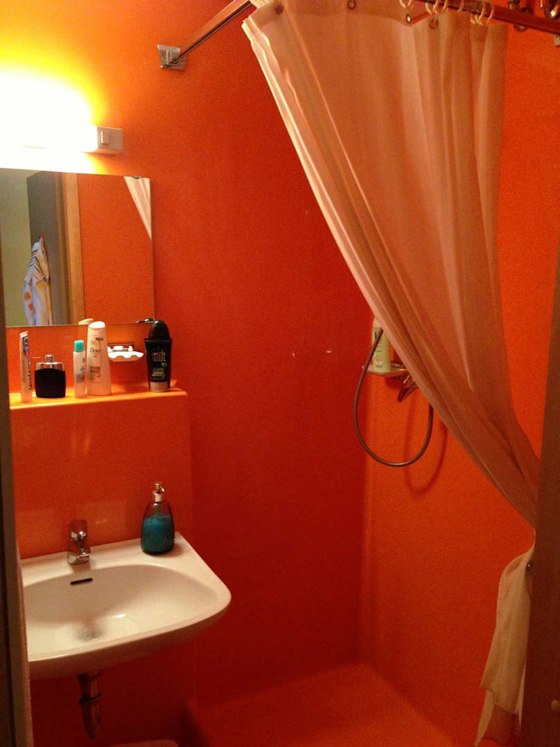 Die Dusche war ein Alptraum in orange. Sie war aus einem Stück Kunststoff gegossen worden. Fairerweise muss man jedoch sagen das der Zustand sehr sauber war.