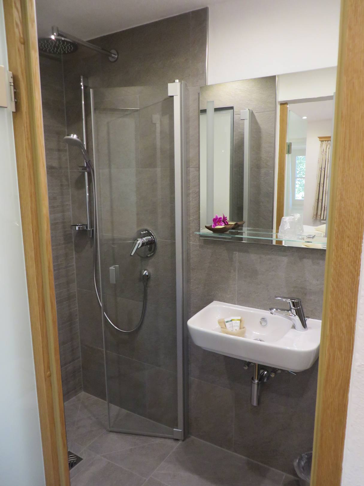 ZimmerBäder liebevoll dekoriert und 5-Sterne-mäßig ausgestattet mit Shampoo, Duschgel, Seife, Kosmetiktüchern, Vergrößerungsspiegel, Regendusche