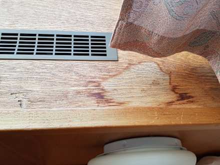Nichtbehandelte Wasserflecken auf Holzverkleidung.