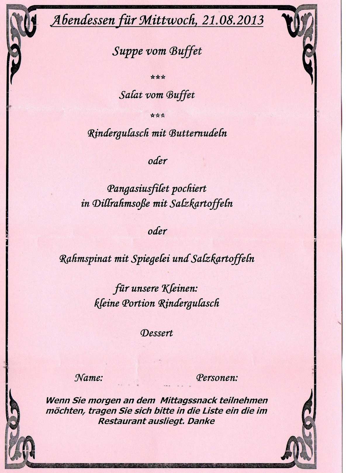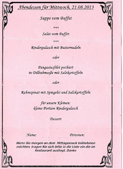 Menue Auawahl3 Hauptspeisen standen zur Auswahl.Dieser Zettel musste am Vorabend abgegeben werden. Es gab sonst am mächsten Tag kein Abendessen.