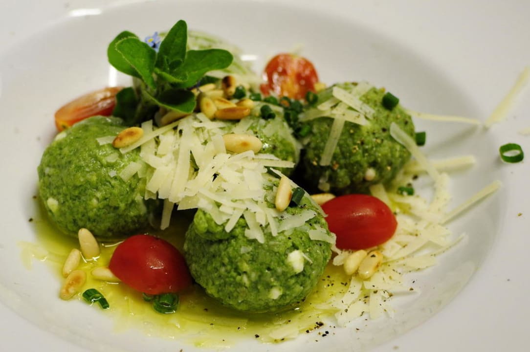 Spinat-Ricotta-Knödel mit zerlassener Butter, Pinienkernen und Parmesan.