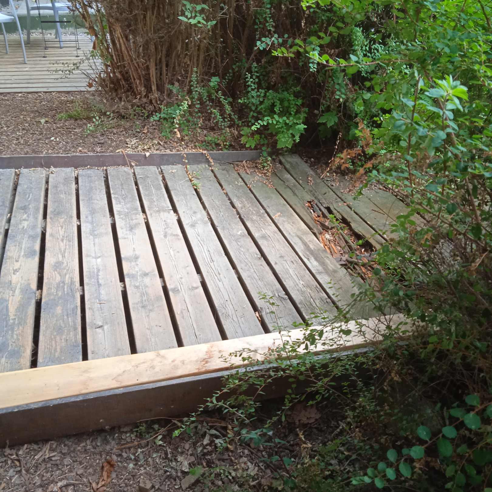 Terrasse mit defekten Holzdielen.