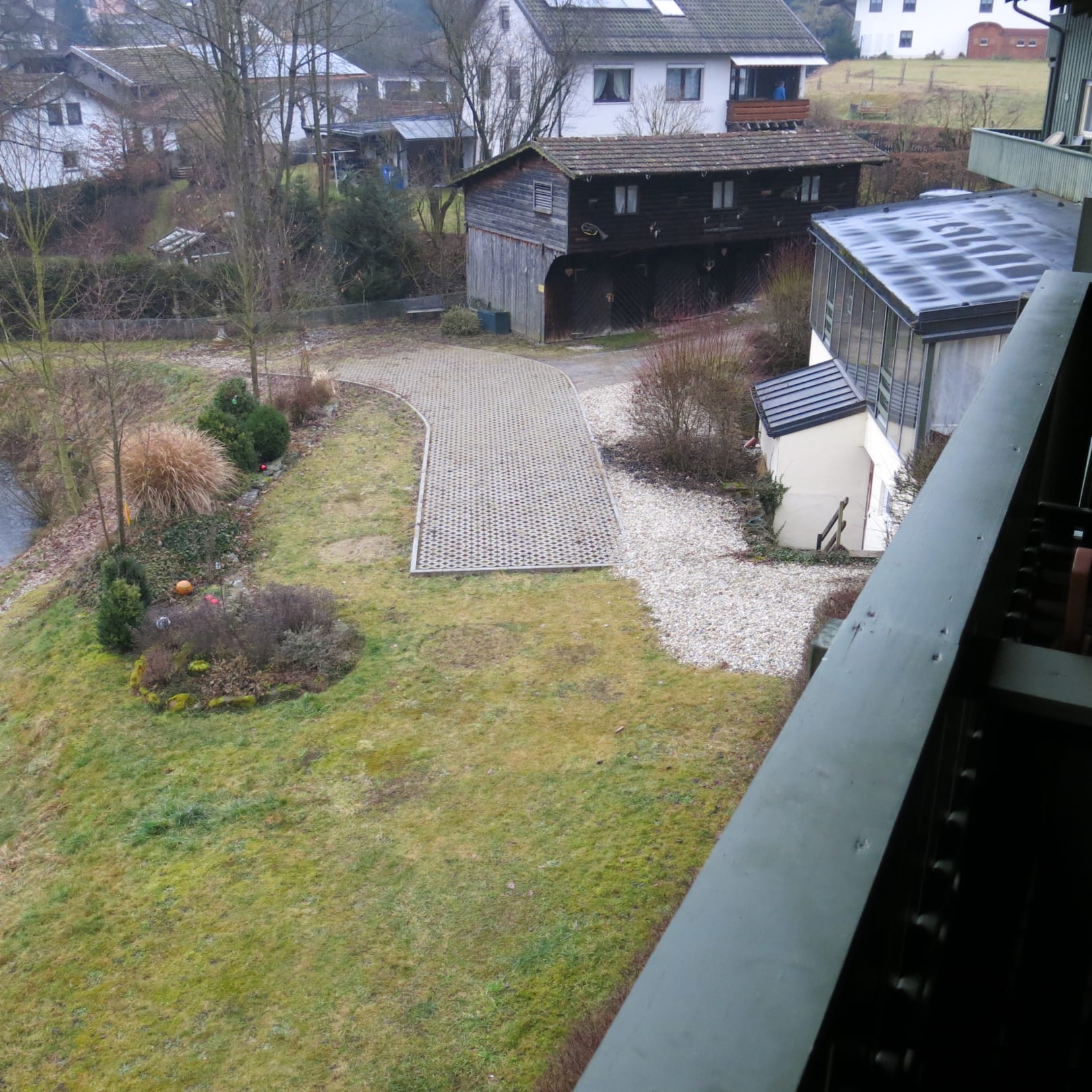 AusblickBlick vom Balkon über das das Restaurant mit dem darunter befindlichen Saunabereich, in den Gartenbereich