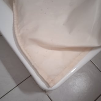 Duschvorhang oben weiß unten gelb und verschimmelt.
