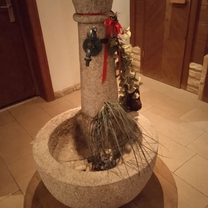Wasserspender im Saunabereich mit Blumen dekoriert.