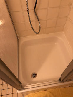 Die Dusche dreckig, gesprungene Fließen.