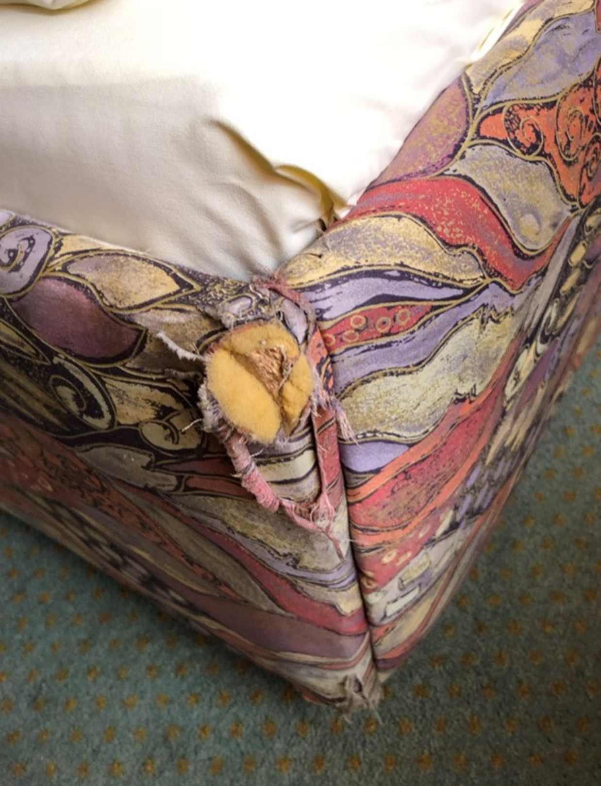 ZimmerZerfetztes Bett auf absolut befleckter Auslageware.