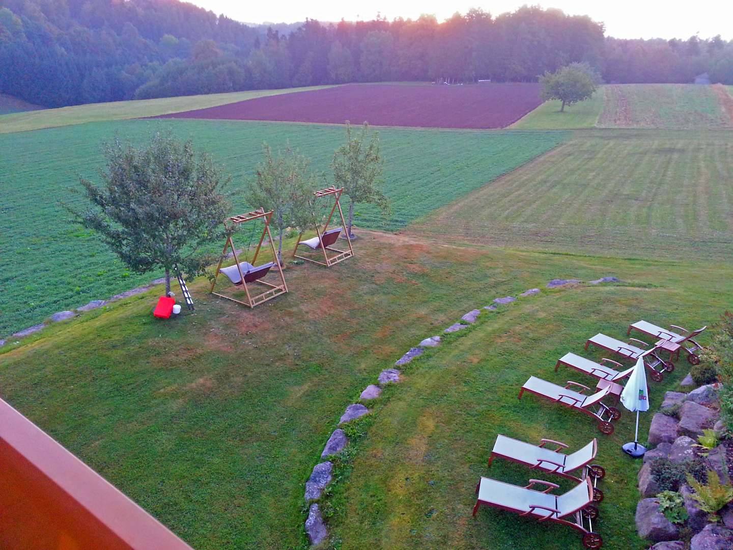 Blick vom Balkon zum Garten und Waldrand am Abend