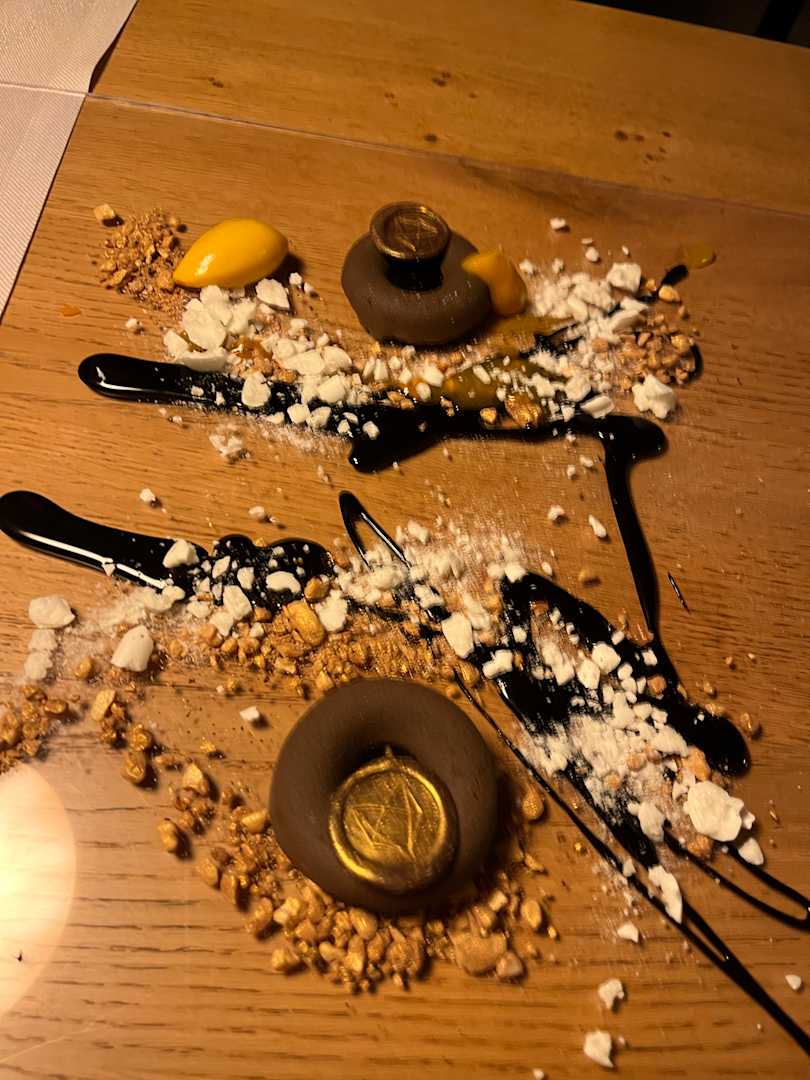 Das Dessert wurde künstlerisch auf einer Glasplatte direkt am Tisch serviert.