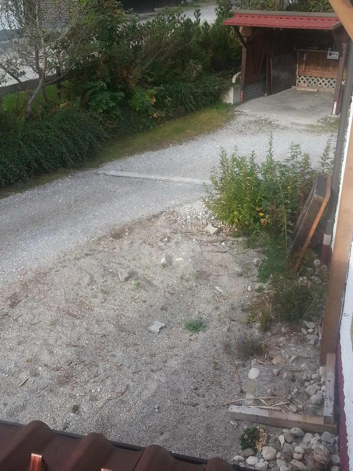 Der Spielplatz, der Sandkasten lehnt an der Hauswand