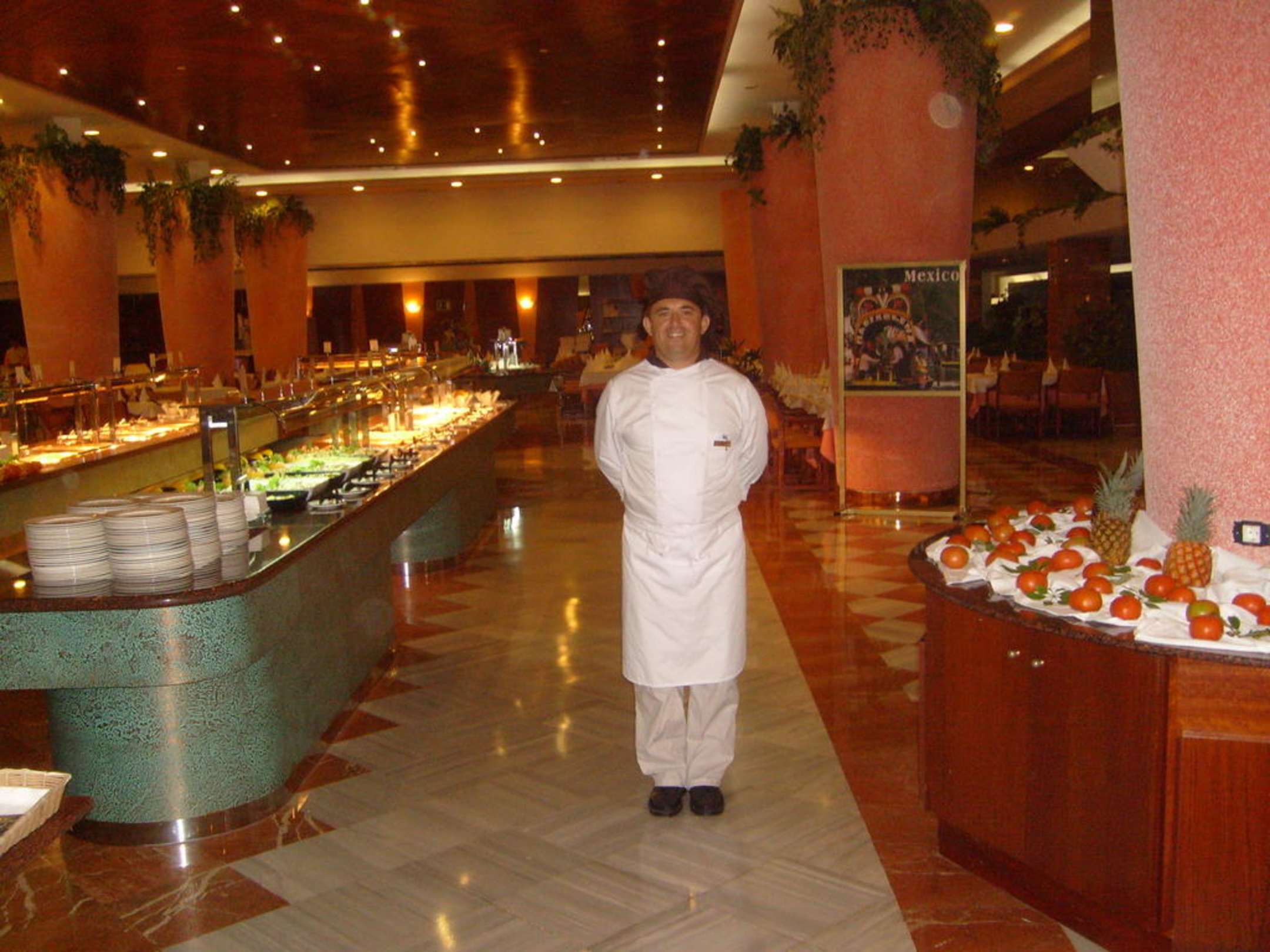 Juan, der Küchenchef, wartet auf meine Frau, um ihr zu zeigen, was sie alles vom Bufett, wegen Ihrer Allergie, essen kann. Wurde jeden Tag so gemacht.