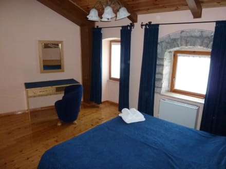 Grosses SchlafzimmerDas grosse Schlafzimmer hat zwei Fenster. Fussboden und Decke sind komplett aus Holz gefertigt, ein Fenster ist in Stein gefasst.