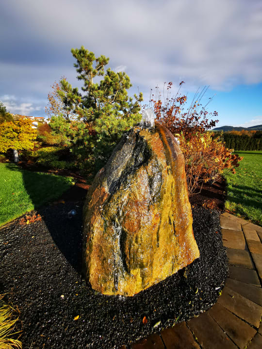 GartenanlageDeko-Stein mit sprudelndem Wasser neben dem Außenpool