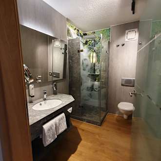 ZimmerSehr schönes Bad mit Regenwalddusche und interessanter Dekoration.