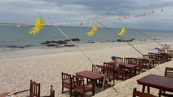 Aussicht vom Restaurant. Bei Ebbe kommen die Felsen im Wasser raus.