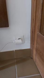 Eine Steckdose ganz unten in der Ecke. Der Putz ist feucht. Gefährlich