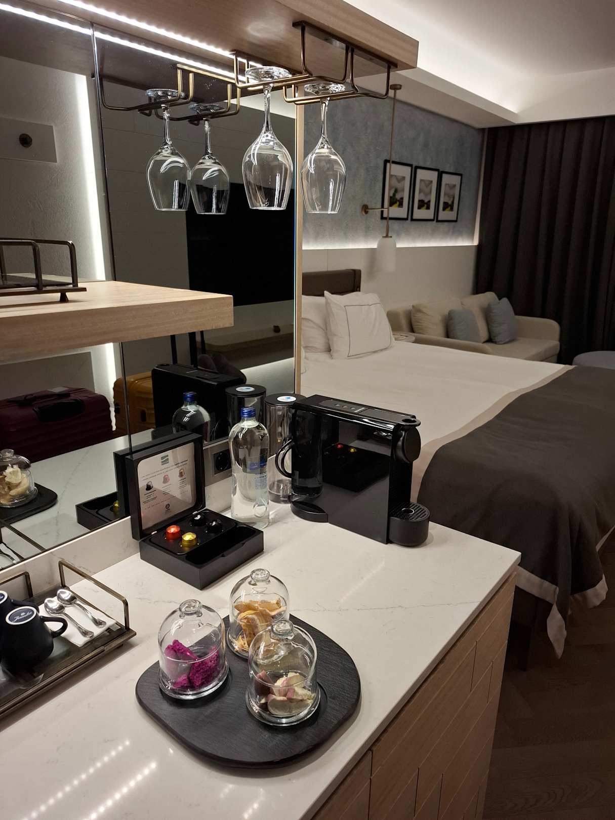 Zimmer bei der Ankunft. Mit Snacks, eigener Kaffeemaschine, gefüllter Minibar etc.