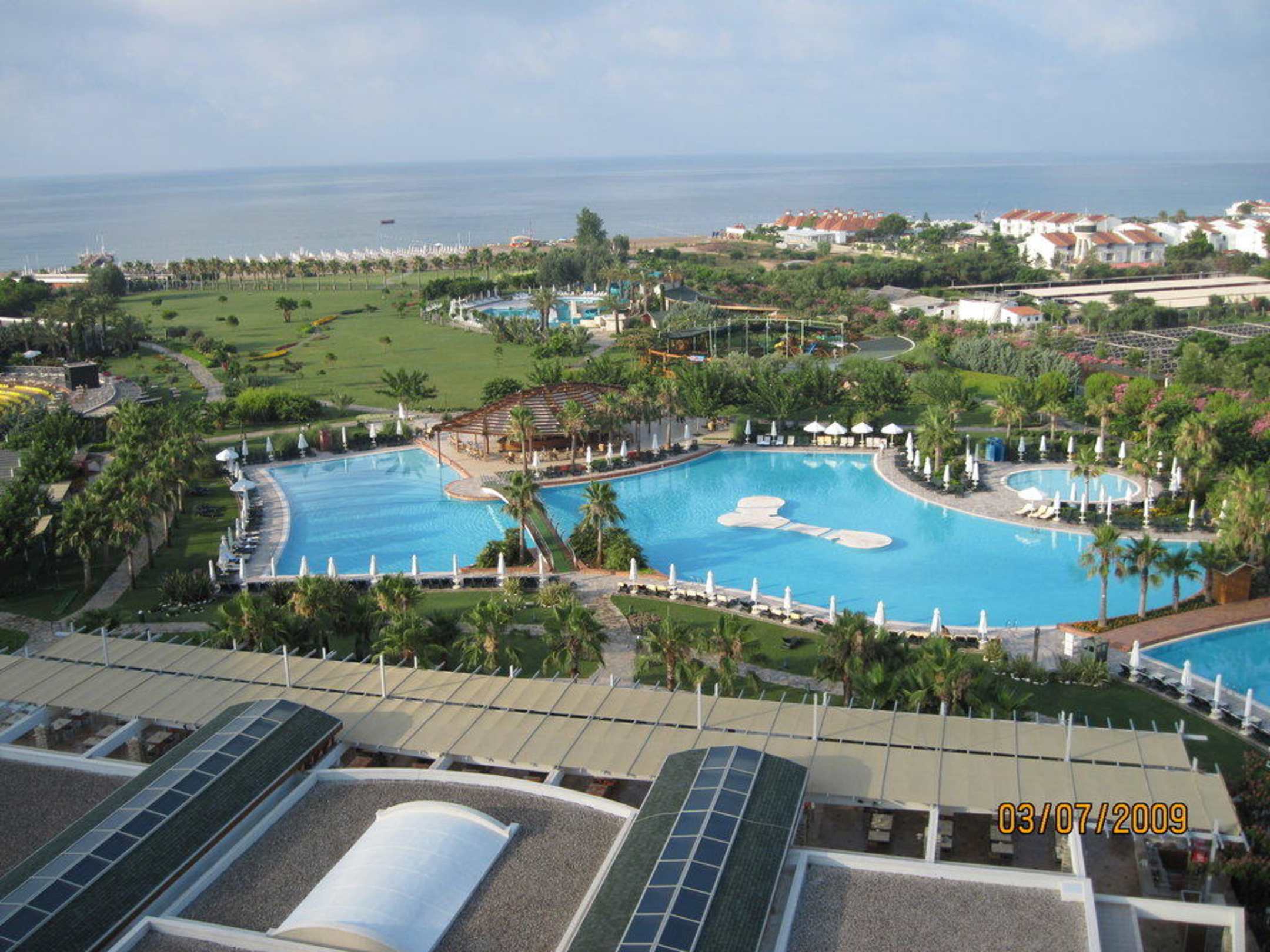 Ausblick auf die Poolanlage vom Zimmer
