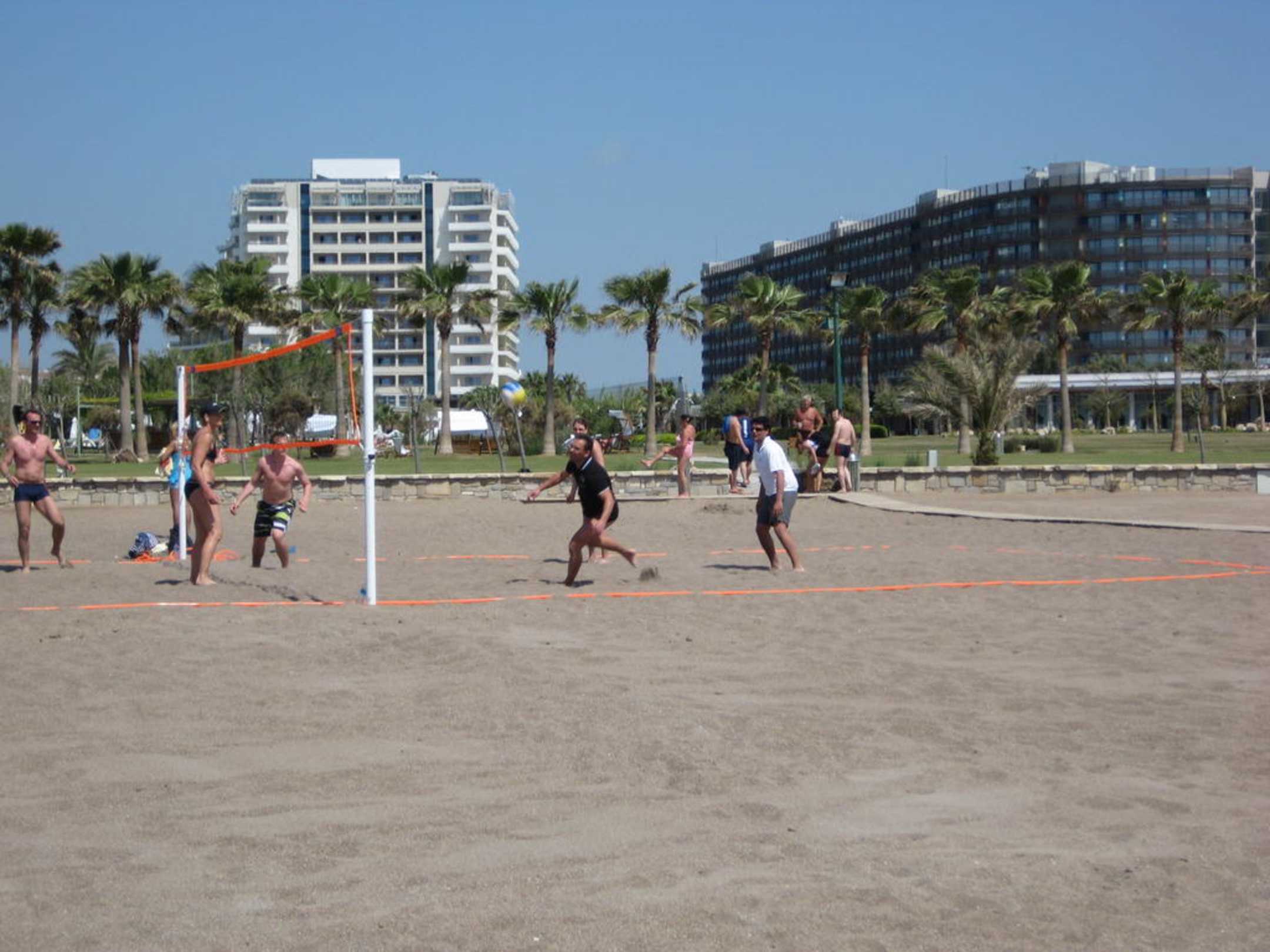 Der Volleyball-Platz und hinten das Hotel