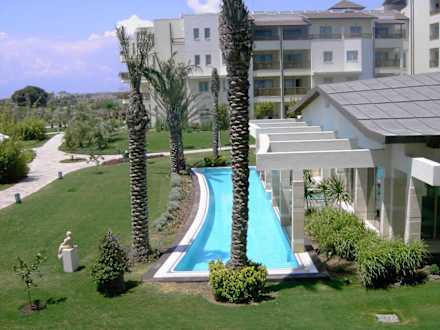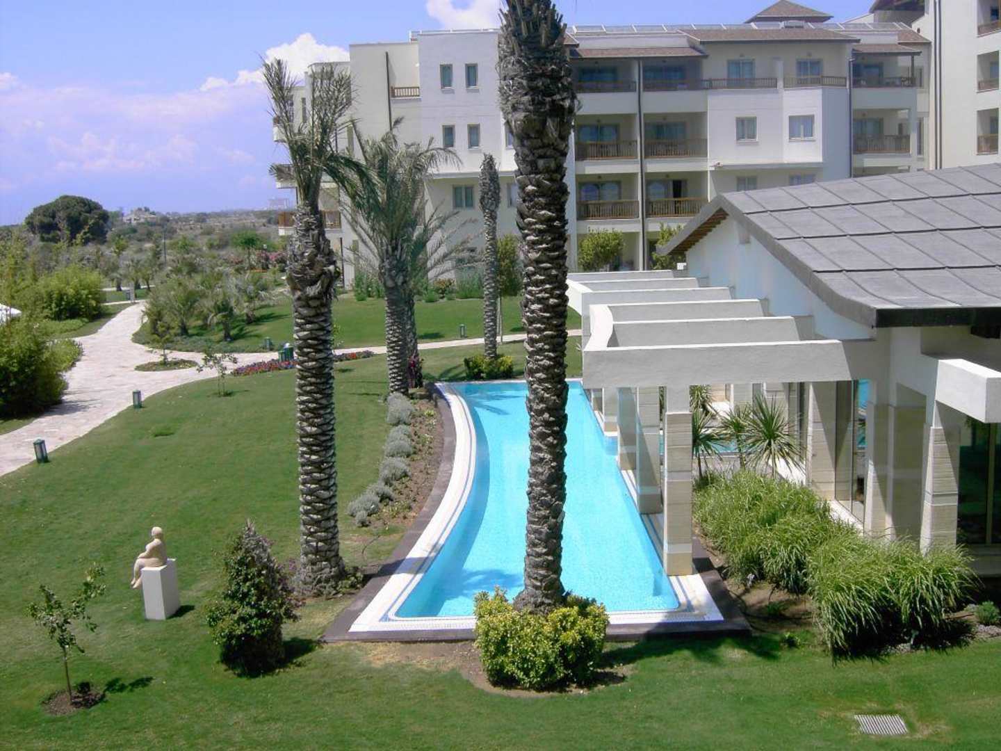 Blick auf das Hallenbad und die Suitenanlage vom Haupthaus