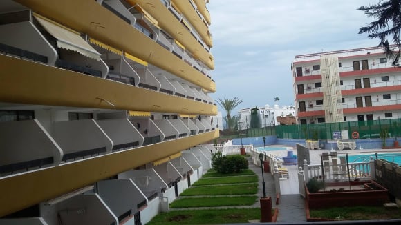 Aussicht vom Bistro auf Pool/Balkone und Innenhof
