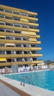 Blick vom Pool auf Balkone
