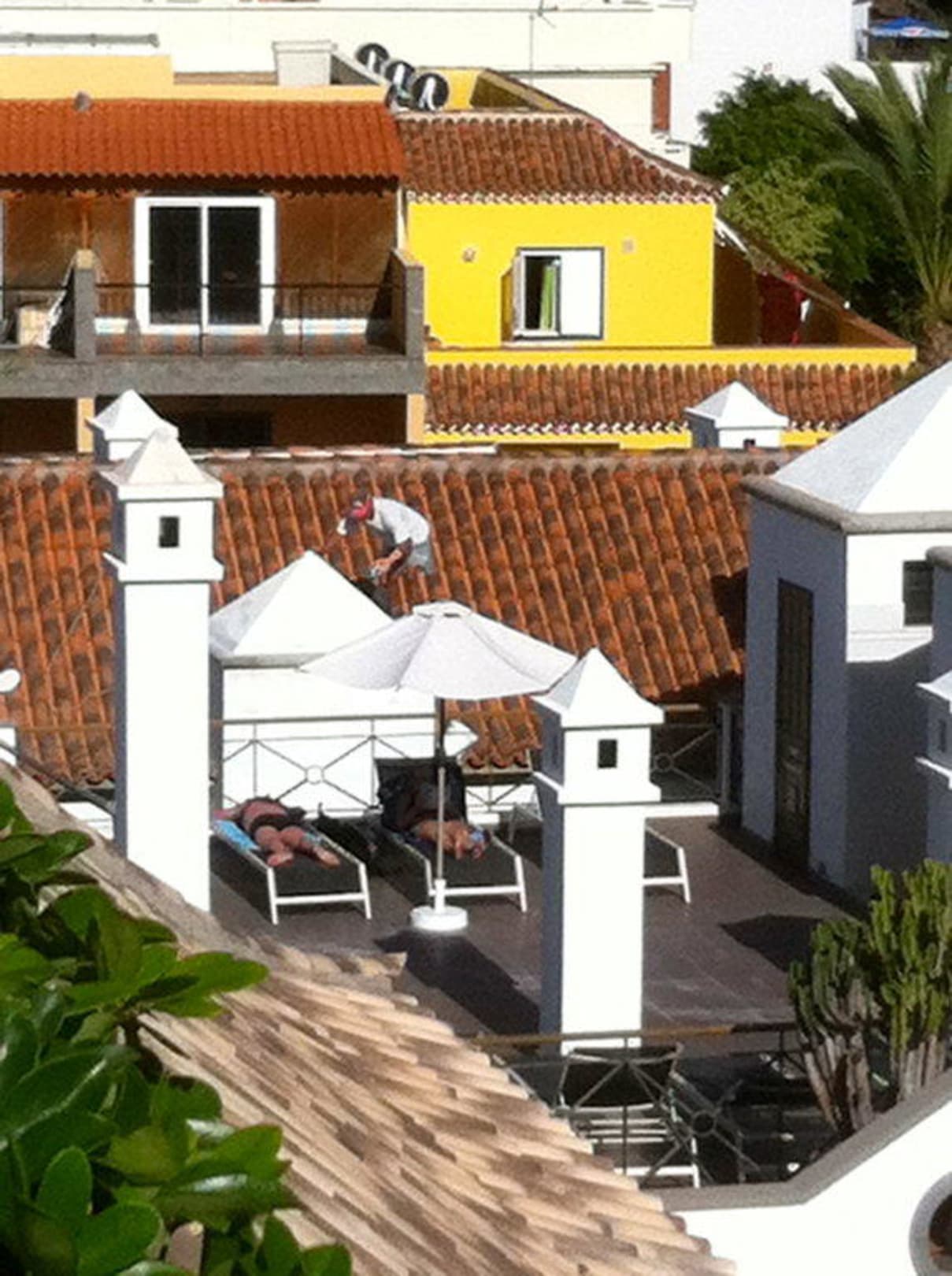 Arbeiten auf dem Hausdach (Poolanlage)Einzelne Gäste ware so mutig und legten sich in dem Dreck und Staubbereich der Poolanlage, während rund rum gearbeitet wurde, mit viel Baulärm. Hier sieht man wie ein Arbeiter quasi über den Köpfen der Gäste auf dem Dach am werkeln war.
