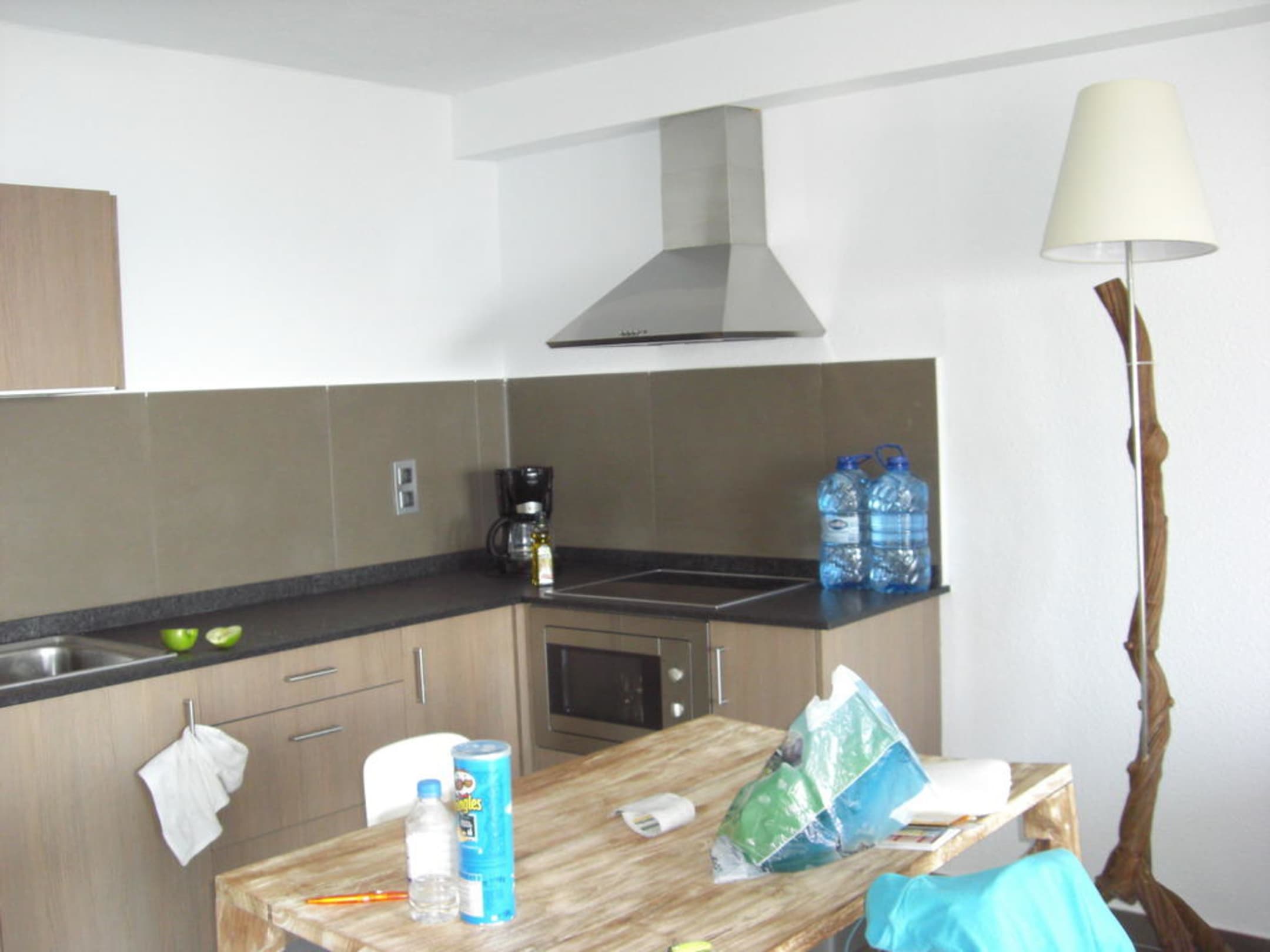 KücheneckeDie Küchenecke mit Cerankochfeld, Mikrowelle, Dunstabzugshaube, Spüle und Kühlschrank mit separatem Tiefkühlfach.
