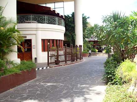 Weg von Spa zum Innenhofoben Lobby , rechts Poolanlage