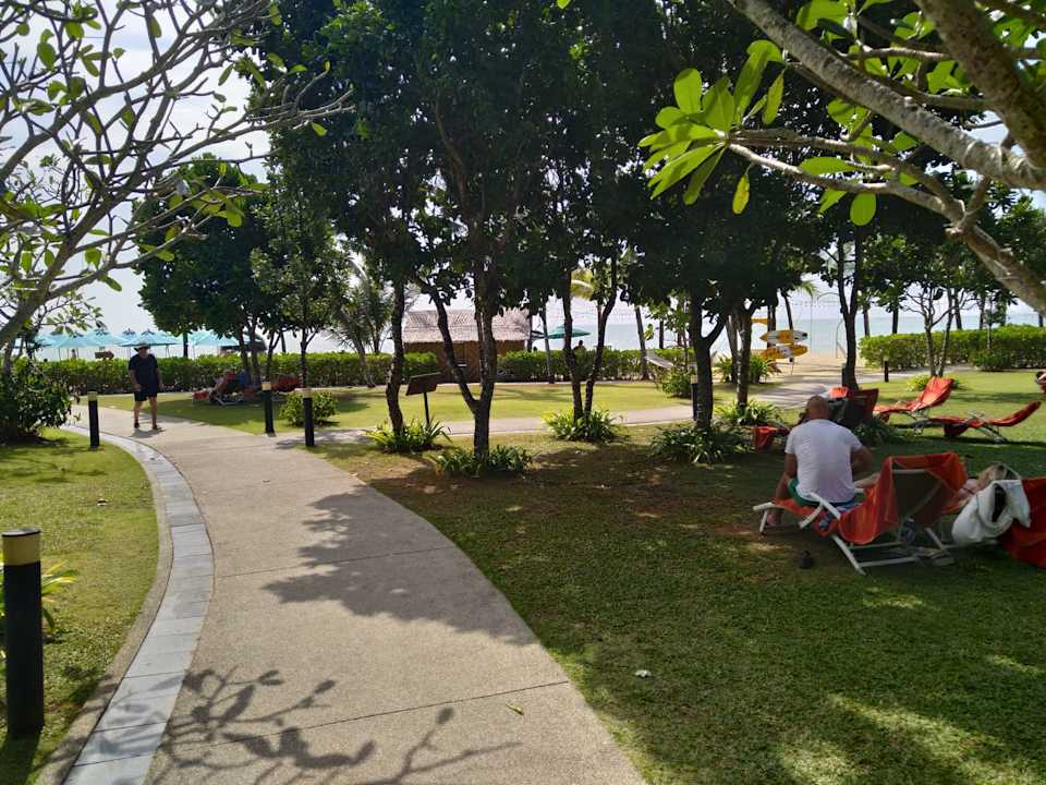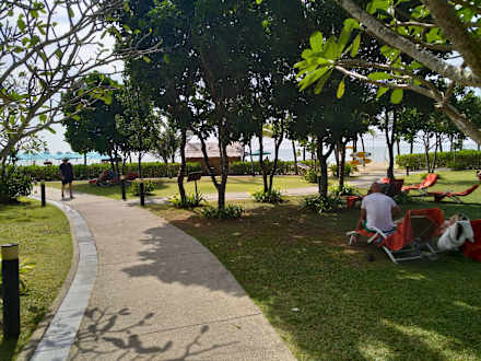Kurzer Weg zum Strand mit Möglichkeiten auf der Wiese im Schatten zu verweilen