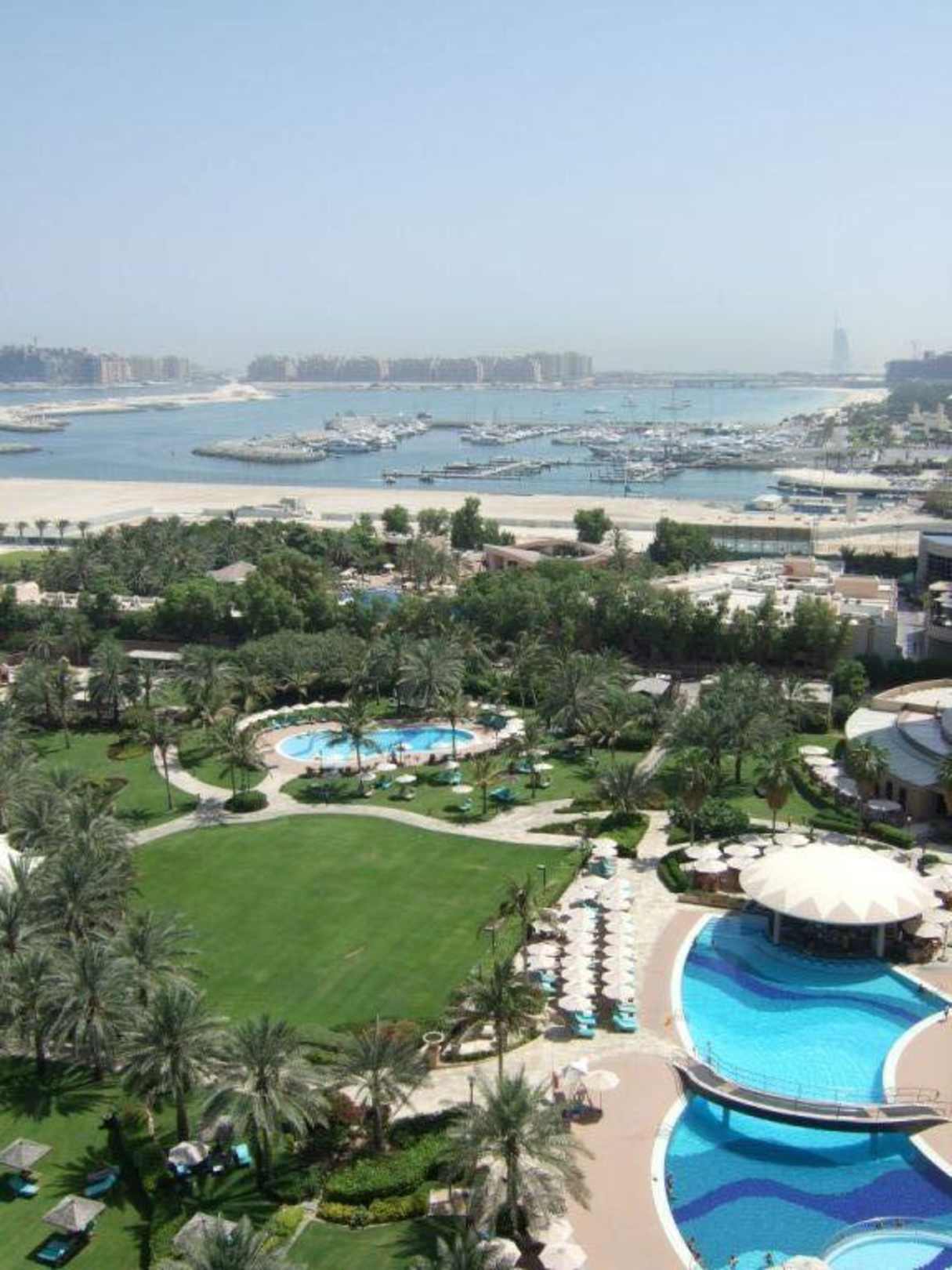 Vom Tower des Hotels (11.OG) - sehr gepflegte grosszügige Garten- und Poolanlage. Vorgelagert die erste künstliche Palmeninsel Palm Jumeirah. Im Hintergrund der Burj Arab.
