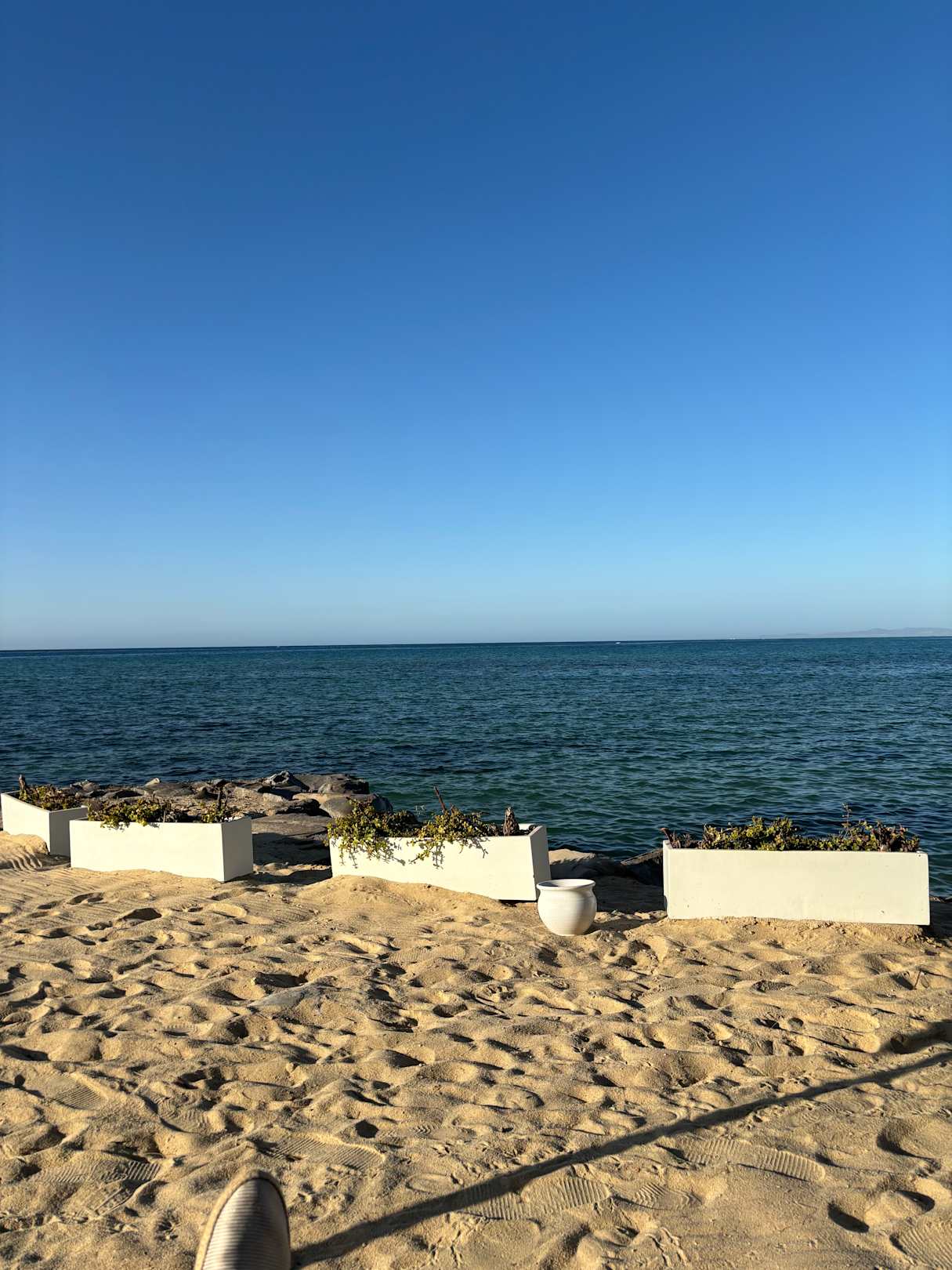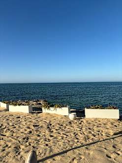 StrandVon der Liege am Strand. Nur eine Reihe Liegen. Schmaler Strand aber mit super Ausblick. Wer einen breiten Strand haben möchte nimmt sich ein Taxi für ca 2€. Das Hotel liegt im eher weniger touristischen Teil Hammamet Nord. Im Süden ist ein Basar etc