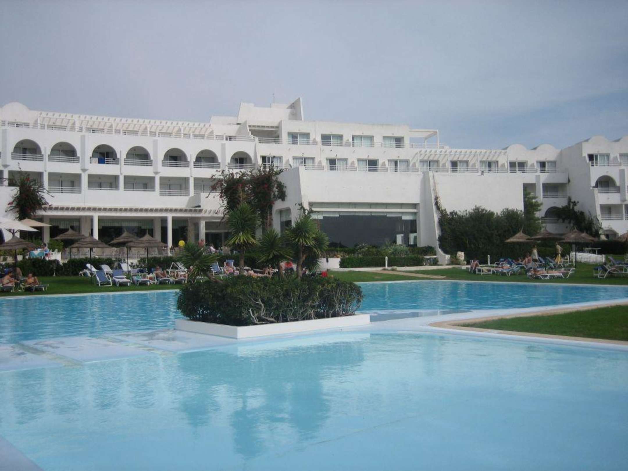 Blick auf Hotelgebäude über Pool