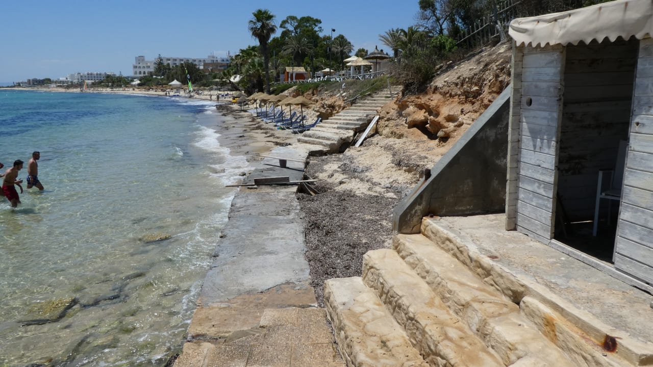 Weit hinten der Hotel-Strand. Im Vordergrund Betonierungsarbeiten an der Zuwegung. Als Gehbehinderter habe ich auf den Weg durchs Meer und über die rutschigen Steine verzichtet.