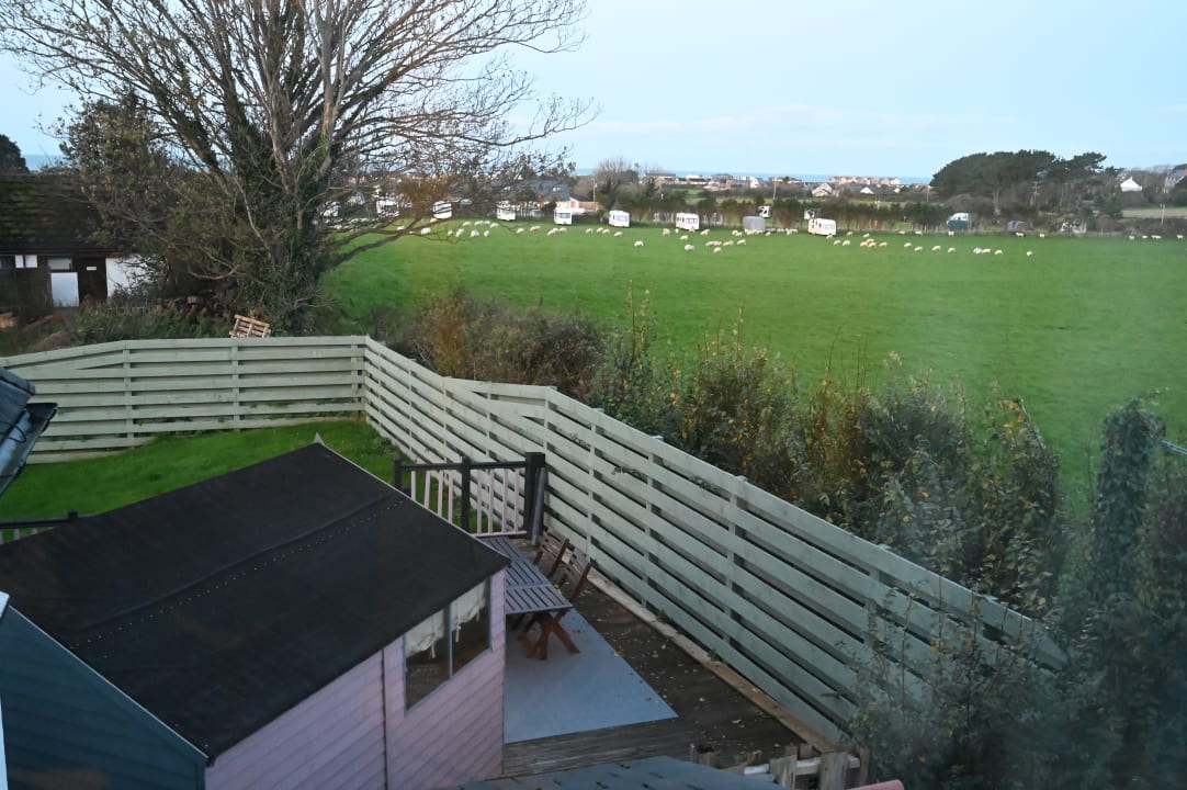 Blick aus dem Zimmer auf eine Schafherde und einen Campingplatz.