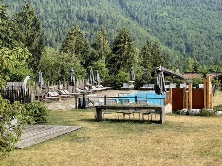 Beheizter Pool mit Sonnenliegen und Sonnenschirmen