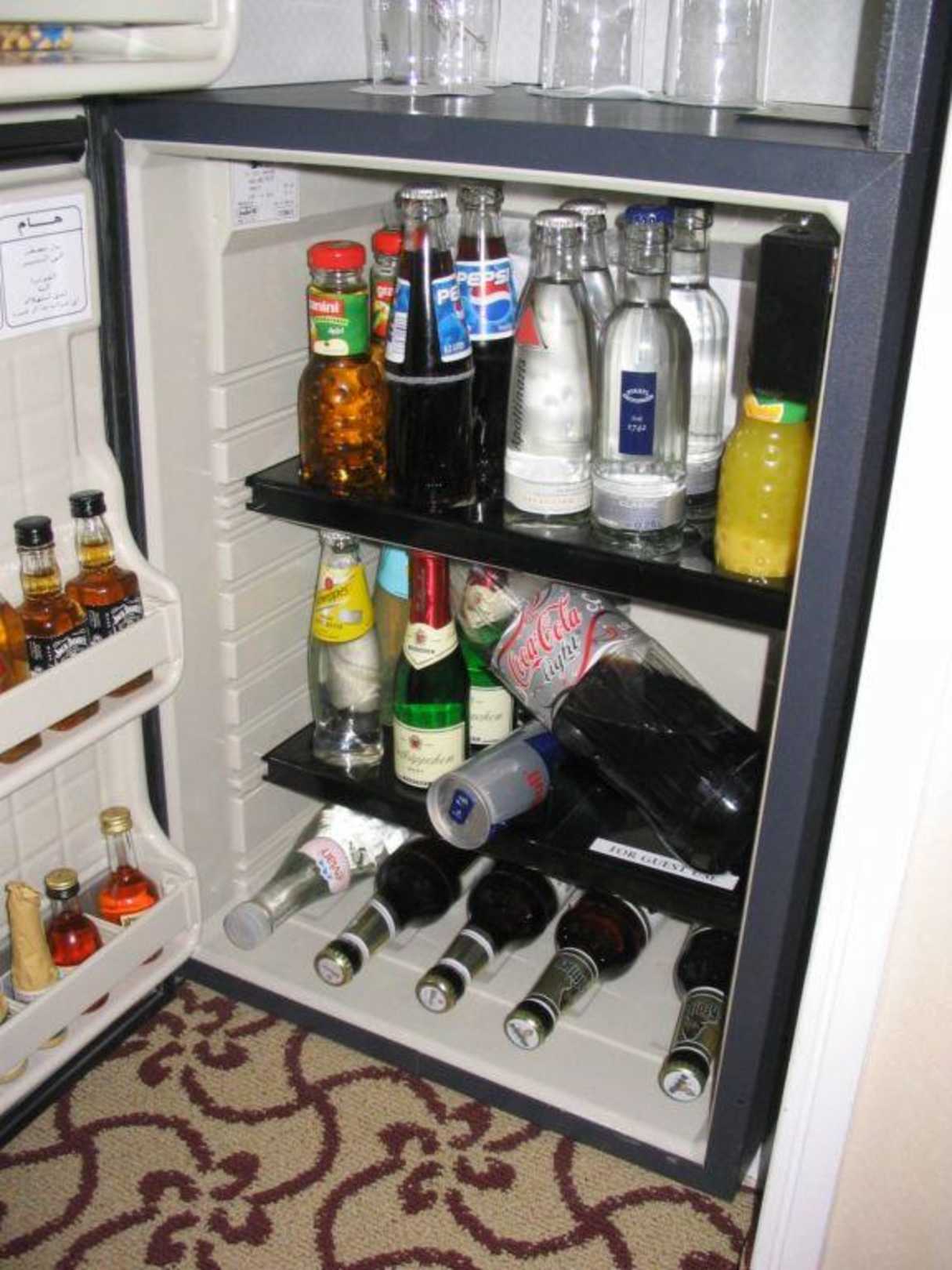 Zimmer 427 MinibarIn anderen Hotels räume ich immer die Minibar aus, um meinen Kram unterzubringen. Hier bietet die Minibar ein kleines Gästefach. So reichte es aus die vorne rechts liegende Dose RED BULL umzulegen, so dass eine 1,5l Flasche Cola reinpasste.