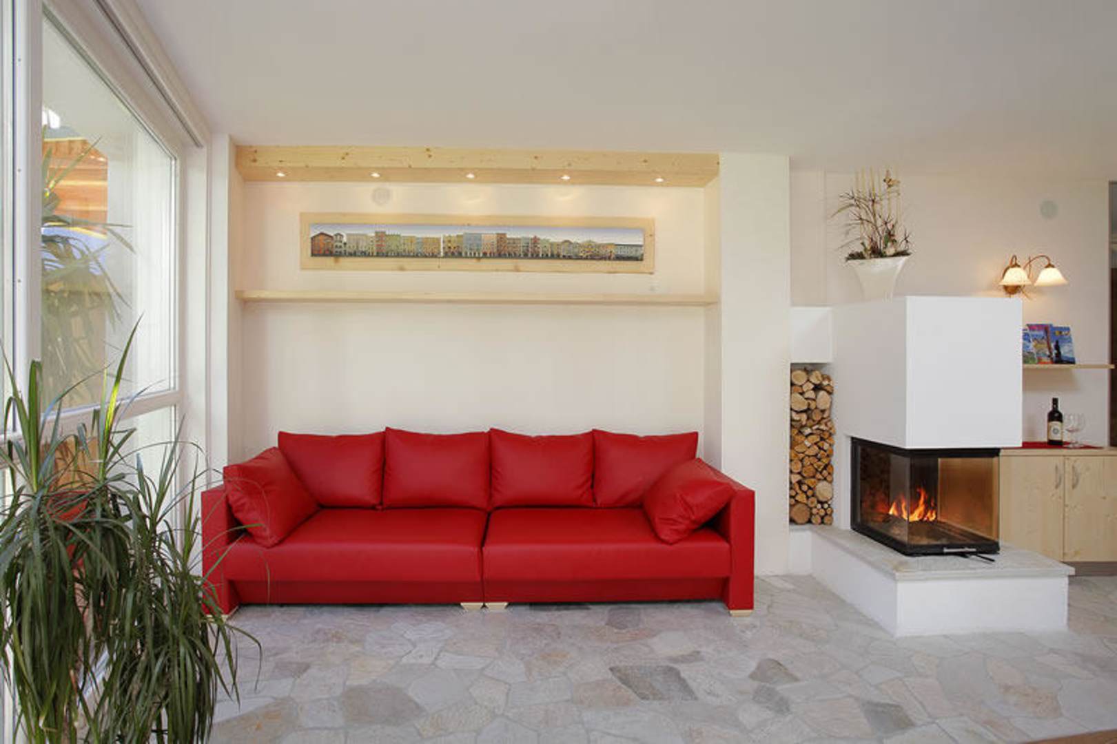 Aufenthaltsraum mit offenem Kamin