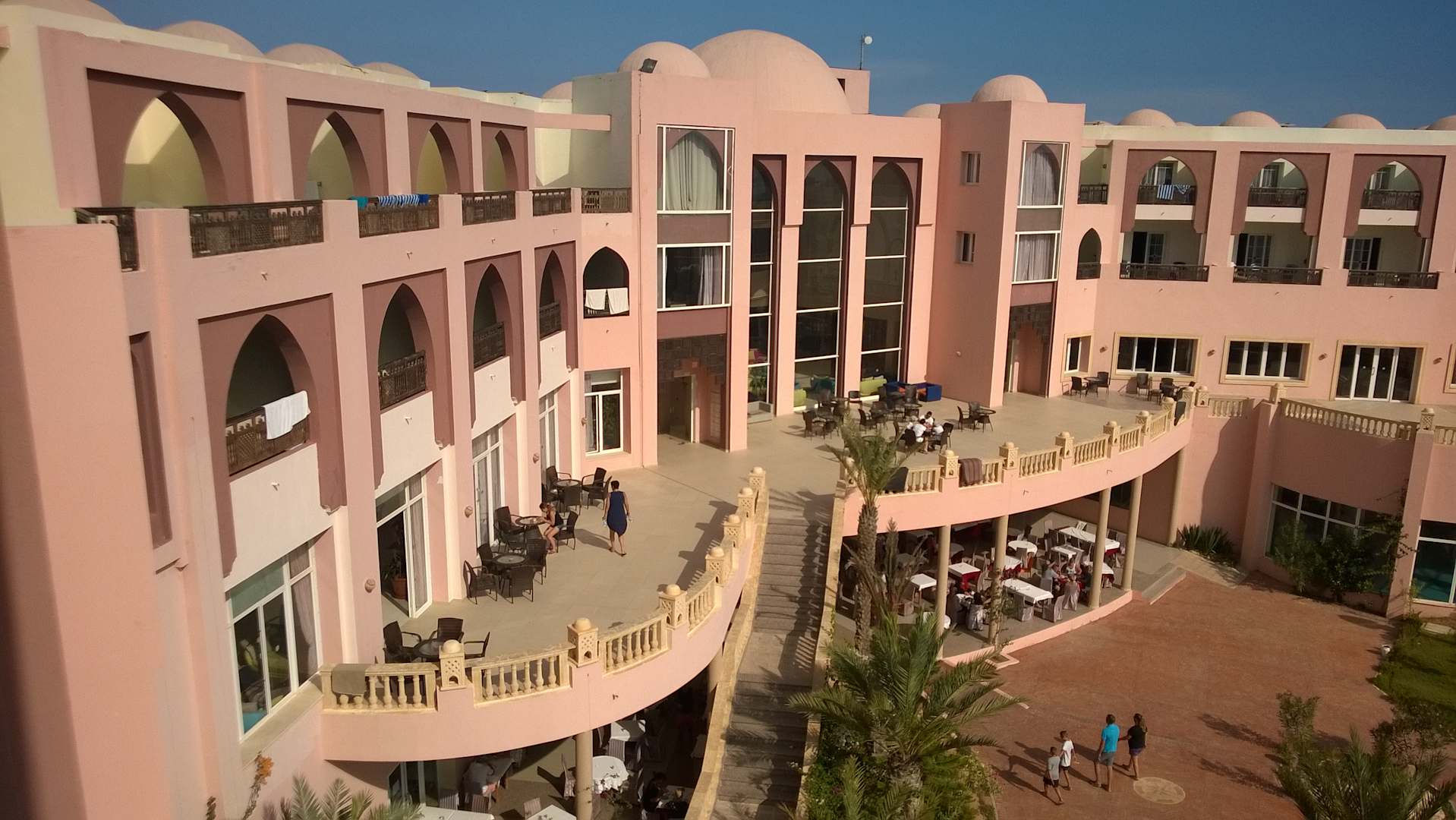 Außenansichtwunderschöne Terrasse aber nur 15 Tische a. 3 Stühle---bei 270 zimmern --und am Abend waren diese noch von nicht Hotelgästen belegt belegt.