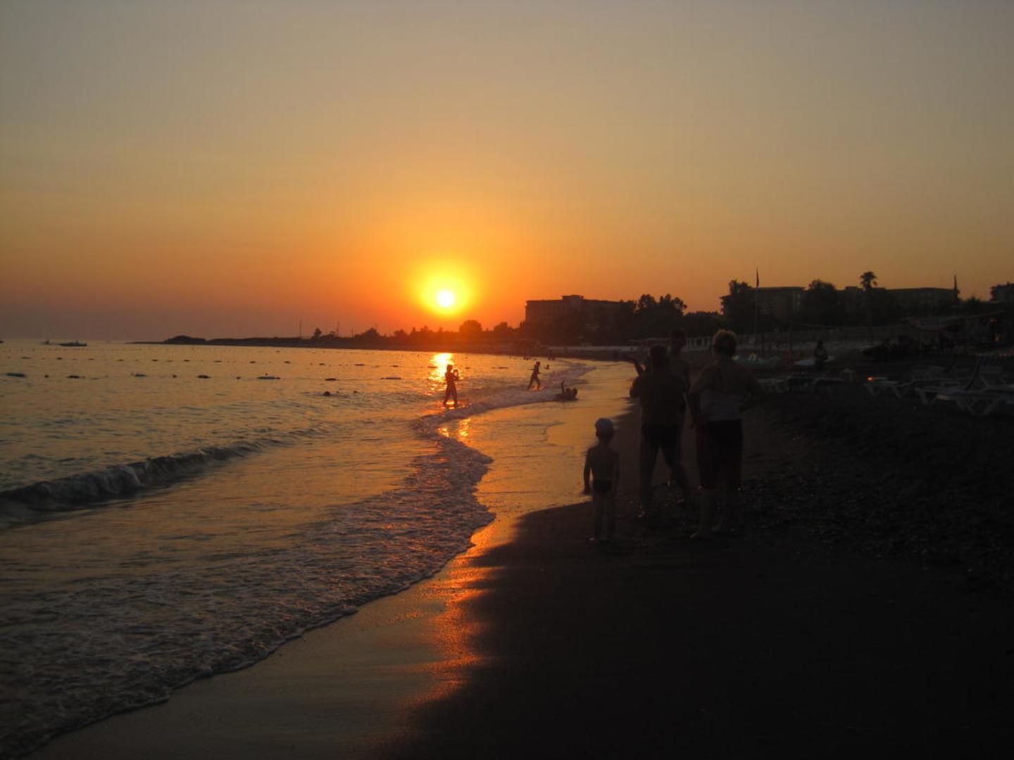 Schöner Sonnenuntergang am Hotelstrand.